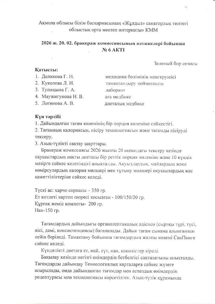 2026 ж. 20. 02. бракераж комиссиясының нәтижелері бойынша № 6 АКТІ